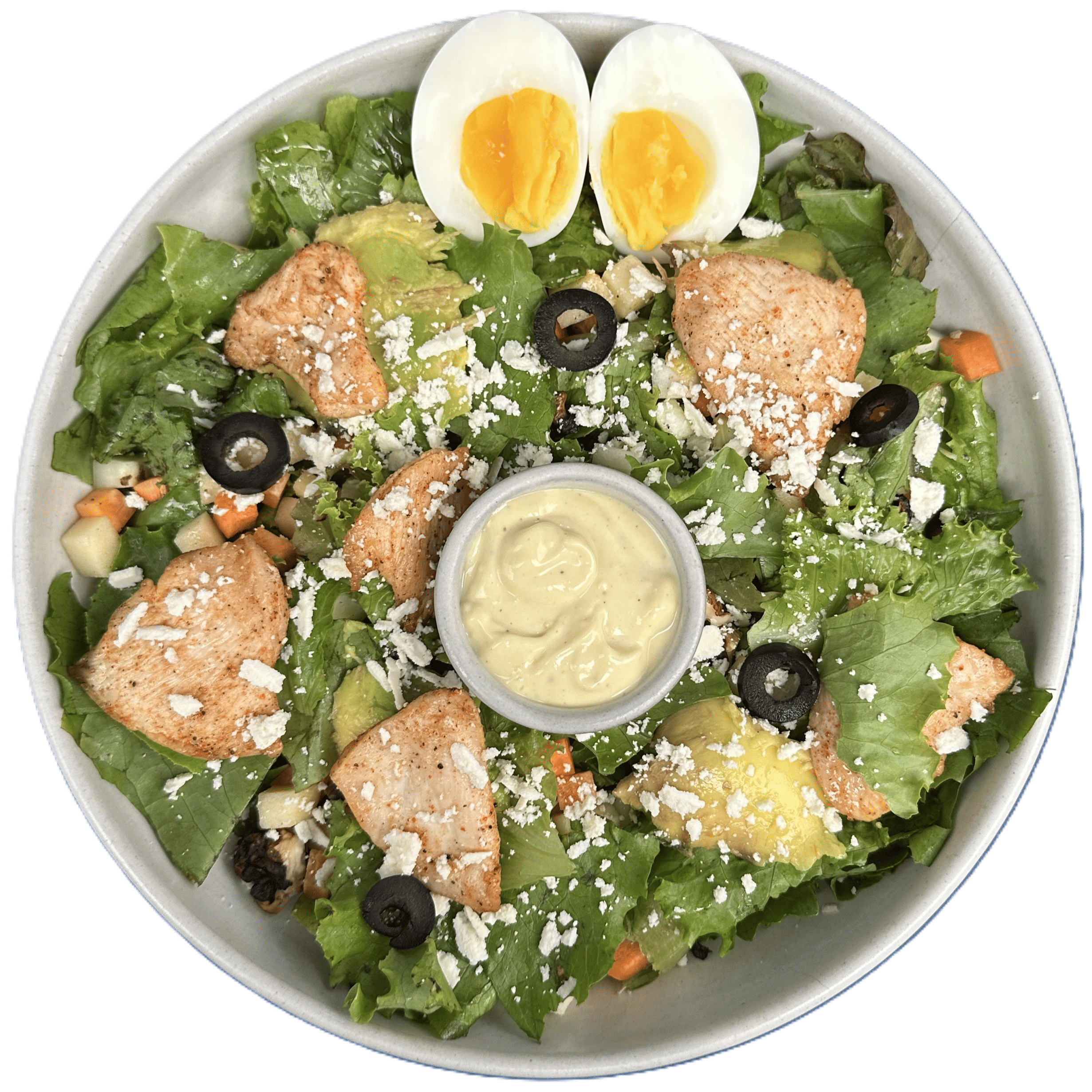 Refresh your day with the Kairos Walnut Chicken Salad! Crisp organic lettuce, crunchy walnuts, shredded carrot, apple, cucumber, and olives are perfectly balanced with grilled chicken, creamy avocado, feta cheese, and a boiled egg. Tossed with your choice of dressing, this wholesome, flavorful salad delivers a satisfying, nutritious meal that’s both light and indulgent.