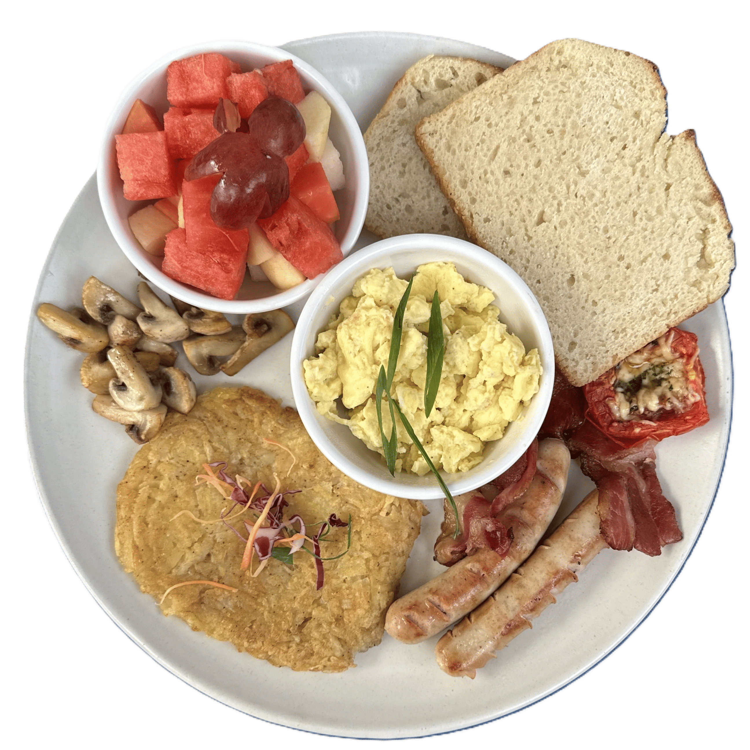 Start your day with the Kairos Special Breakfast! Enjoy crispy hashbrowns, savory sausages, bacon, and fried mushrooms, paired with juicy grilled tomatoes and perfectly toasted sourdough bread. Served with a side of seasonal fruits and your choice of eggs, this hearty, flavorful breakfast is crafted to energize your morning and satisfy every craving.