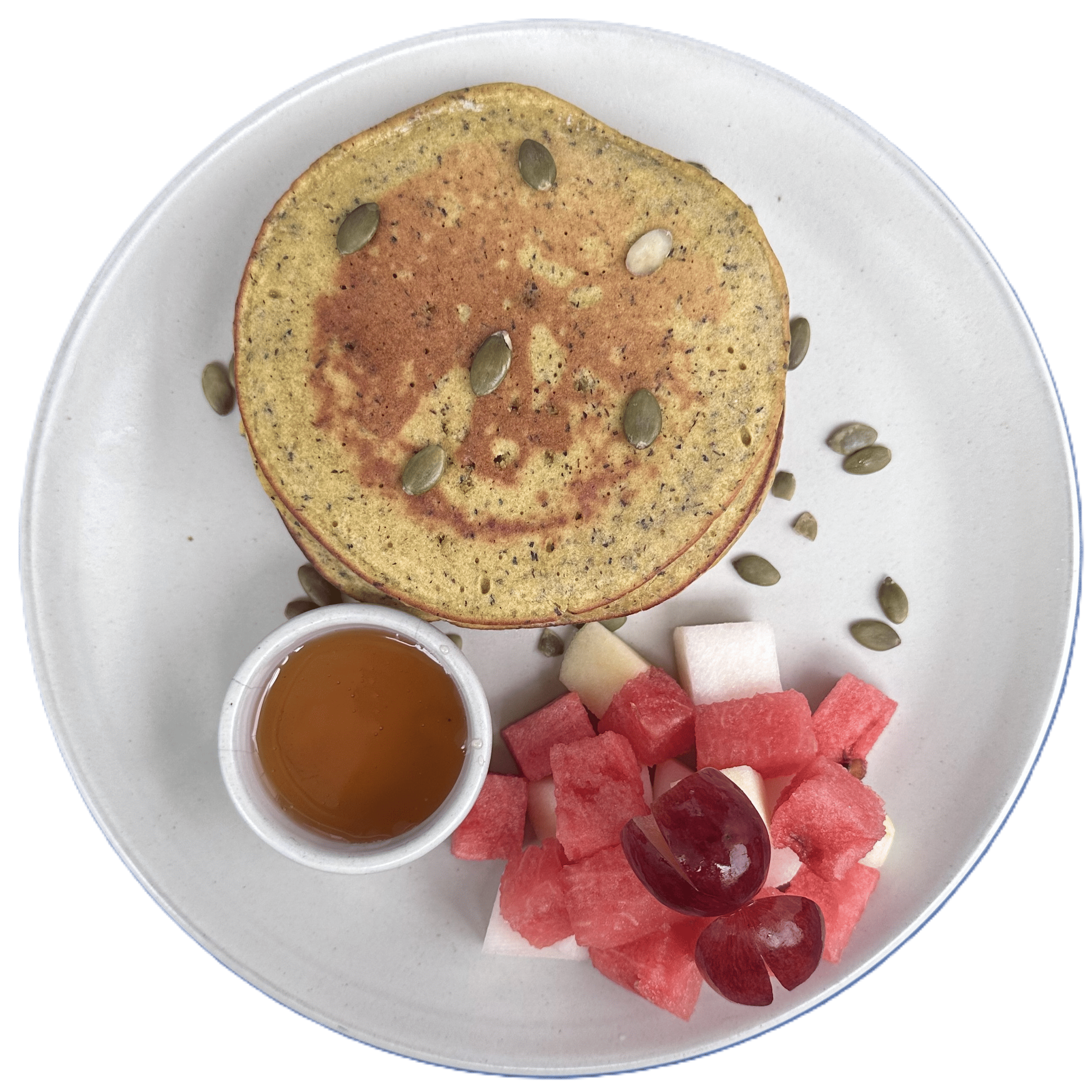 Delight in our Pumpkin Pancakes, fluffy and perfectly spiced for a comforting breakfast or brunch. Served with creamy butter and a drizzle of honey, each bite is warm and indulgent. Accompanied by a fresh side of seasonal fruits, this sweet, flavorful treat balances richness and freshness, making every mouthful a delightful start to your day.